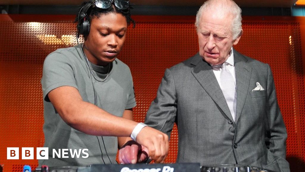 The King admits “trying to get a hang of it” while having a go at being a DJ during a visit to Manchester.